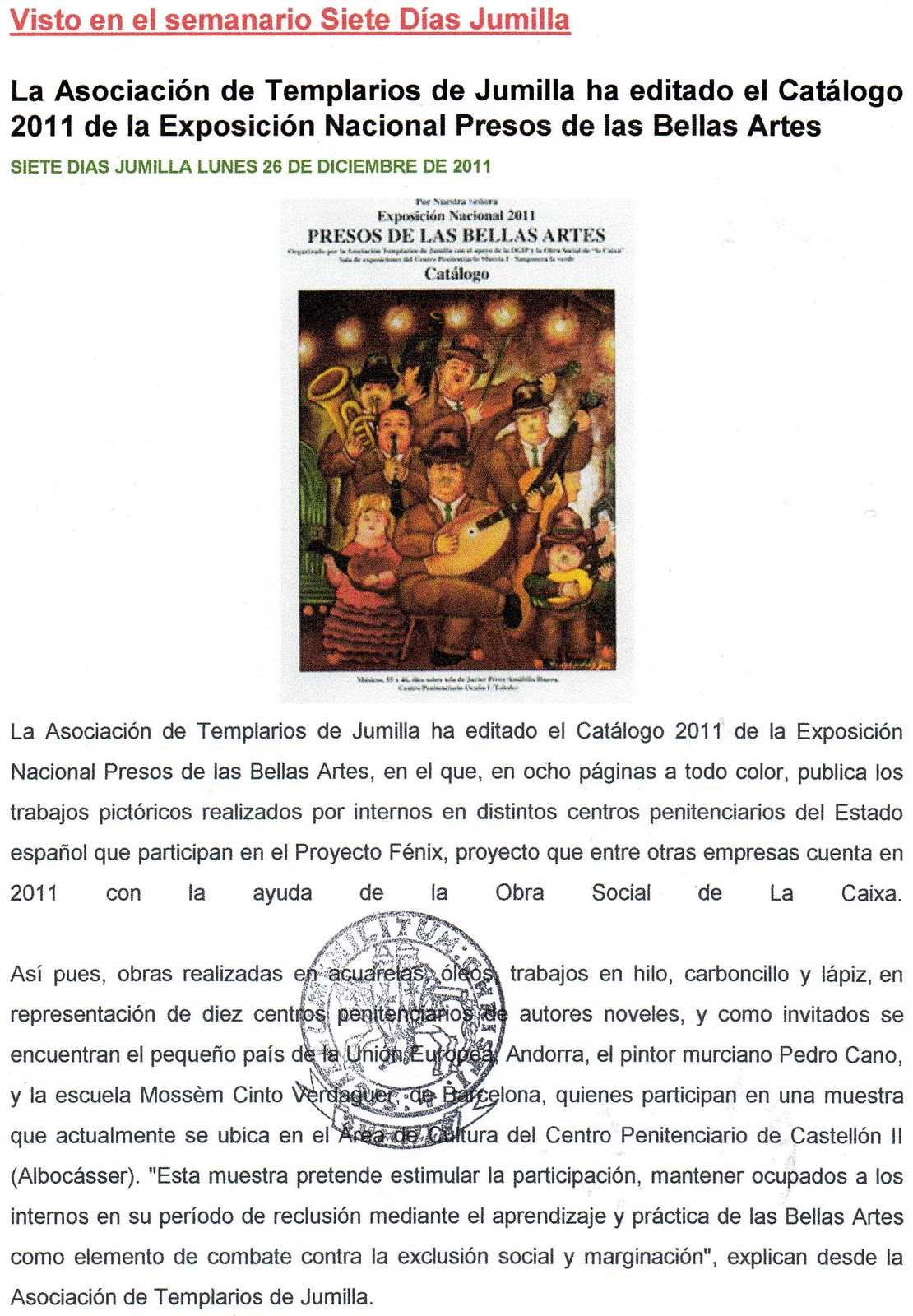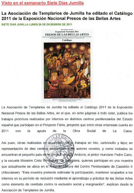 La Exposición Nacional Presos  de las Bellas Artes y Artesanía 2014, que del 5 al 25 del presente mes se exhibe en el Área Sociocultural del Centro Penitenciario MUII ubicado en el  municipio murciano de Campos del Río,  cuyos autores son reclusos en centros penitenciarios del territorio español que participan en el Proyecto Fénix de los milites Christi de la ciudad murciana famosa por el temple de sus vinos, que emplean como terapia educativa y lucha contra la exclusión social las bellas artes y artesanía, cuenta con el óleo  pigmento “Jalima II”, de 100 x 100 cm sobre lienzo, cedida a los templarios por el pintor muleño,  afincado en Nueva York, Cristóbal Gabarrón,   que con su obra y arte se suma a la lucha contra la exclusión social y fomento de las Bellas Artes entre la población reclusa cómo terapia reeducadora, cediendo una de sus obras valorada en más de trenta y seis mil euros, según informan fuentes templarias dignas de todo crédito.